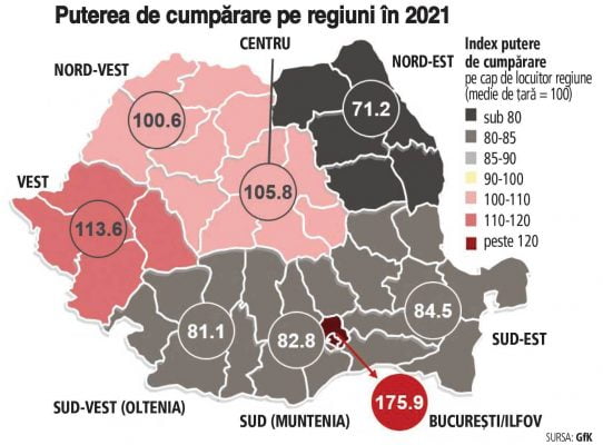 İşviçreli Pazar araştırma şirketi GfK tarafından hazırlanan 2021'deki satın alma gücü haritası, Romanya'da bölgeler arasında ekonomik kalkınmadaki farklılıkları gözler önüne seriyor. Spesifik olarak, Bükreş'te satın alma gücü Avrupa ortalamasına yakınsa, ülkenin en fakir bölgesi olan Moldova'da neredeyse üçte bire düşüyor. Moldova bölgesinde