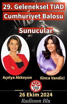“Romanya Türk toplumunun en prestijli etkinliği olan, TİAD Geleneksel Cumhuriyet Galası'nı, bu sene 26 Ekim 2024, Cumartesi günü, Bükreş Radisson Blu Otel'de düzenleyeceğiz. Ülkemizin 101. ve Derneğimizin 31. kuruluş yıl dönümünü, Büyükelçimiz Sn. Özgür Kıvanç Altan’ın teşrifleriyle, Üyelerimiz, çeşitli ülkelerin Büyükelçileri, Türk ve Romen resmi kurumlarının temsilcileri ve Romen dostlarımızla birlikte kutlayacağız.