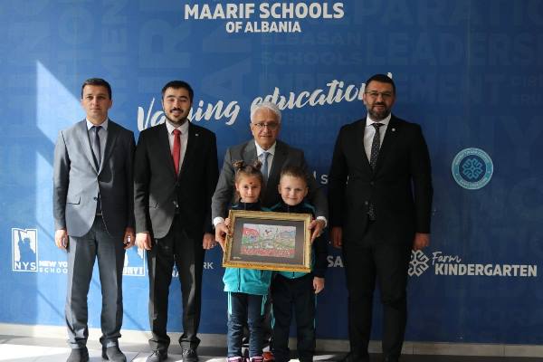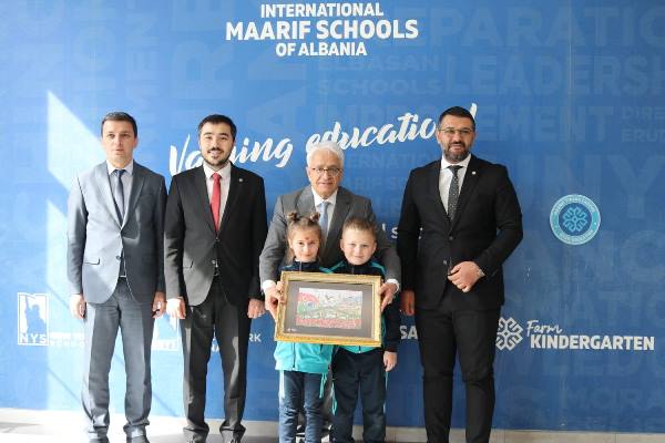 TİKA Tiran Program Koordinatörü Mustafa Ata eşliğinde Maarif okullarına giden Dr. Mahmut Çevik okulda, Maarif Tiran Üniversitesi Rektörü Prof. Dr. Ali Güneş, Maarif Okulları Arnavutluk Koordinatörü Mesut Özbaysar, öğretmen ve öğrenciler tarafından çiçeklerle karşılandı.