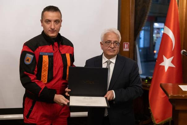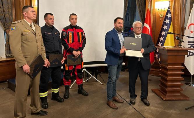 TİKA'nın arama kurtarma ekiplerine yönelik verdiği eğitimlerin devam edeceğini aktaran Çevik, Bosna Hersekli ekiplere teşekkür belgesi takdim etti.