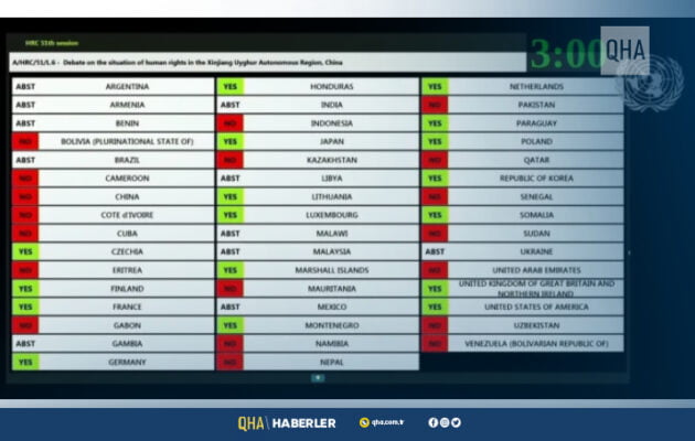 Doğu Türkistan’daki insan hakları ihlalleri durumunun görüşülmesi için sunulan tasarı, 17 “kabul” oyuna karşı 19 “ret” ve 11 “çekimser” oyla reddedildi. Aralarında Almanya, Fransa, Çekya, Finlandiya, Polonya, Güney Kore, ABD ve Birleşik Krallık’ın olduğu ülkeler tasarı için “kabul” oyu kullanırken, Bolivya, Küba, Gabon, Endonezya, Kazakistan, Pakistan, Katar, Birleşik Arap Emirlikleri, Nepal, Sudan ve Özbekistan’ın bulunduğu ülkeler ise ret oyu verdi. Ukrayna, Malezya ve Hindistan dahil oturuma katılan diğer ülkeler ise çekimser oy kullandı.