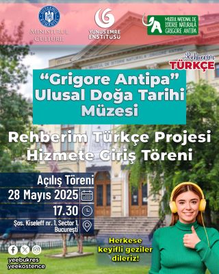 Yunus Emre Enstitüsünce yürütülen Rehberim Türkçe Projesi ile Romanya’daki müze ve ören yerleri Türkçeleştiriliyor. 28 Mayıs saat 17.30’da Bükreş’in en çok ziyaret edilen müzesi olan Grigore Antipa Ulusal Doğa Tarihi Müzesinde düzenlenecek açılış töreni ile müze, artık Türkçe olarak da hizmet verecek. Bütün vatandaşların davetli olacağı törenle birlikte müzede; sesli rehber, dijital materyaller artık Türkçe olacak ve ücretsiz kullanıma açılacaktır.