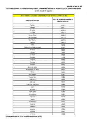 Türkiye, 17 Aralık 2020 itibariyle Romanya Ulusal Acil Durumlar Komitesi (UADK) tarafından Covid-19 vaka sayısı Romanya'yı aşan ülkeler listesine (Sarı Liste) alınmıştır. Bu çerçevede, ülkemizden Romanya’ya seyahat edecek vatandaşlarımız ve Romanya vatandaşları için genel uygulama aşağıda sunulmaktadır:
