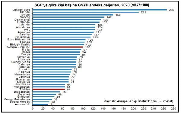 *Avrupa Birliği İstatistik Ofisi (Eurostat) tarafından açıklanan Satınalma Gücü Paritesi'ne (SGP) göre kişi başına gayrisafi yurt içi hasıla (GSYH) endeksi 2020 yılı geçici sonuçlarına göre, 100 olan 27 Avrupa Birliği (AB) ülkesi ortalaması, Türkiye için 64 oldu ve AB ortalamasının yüzde 36 altında kaldı