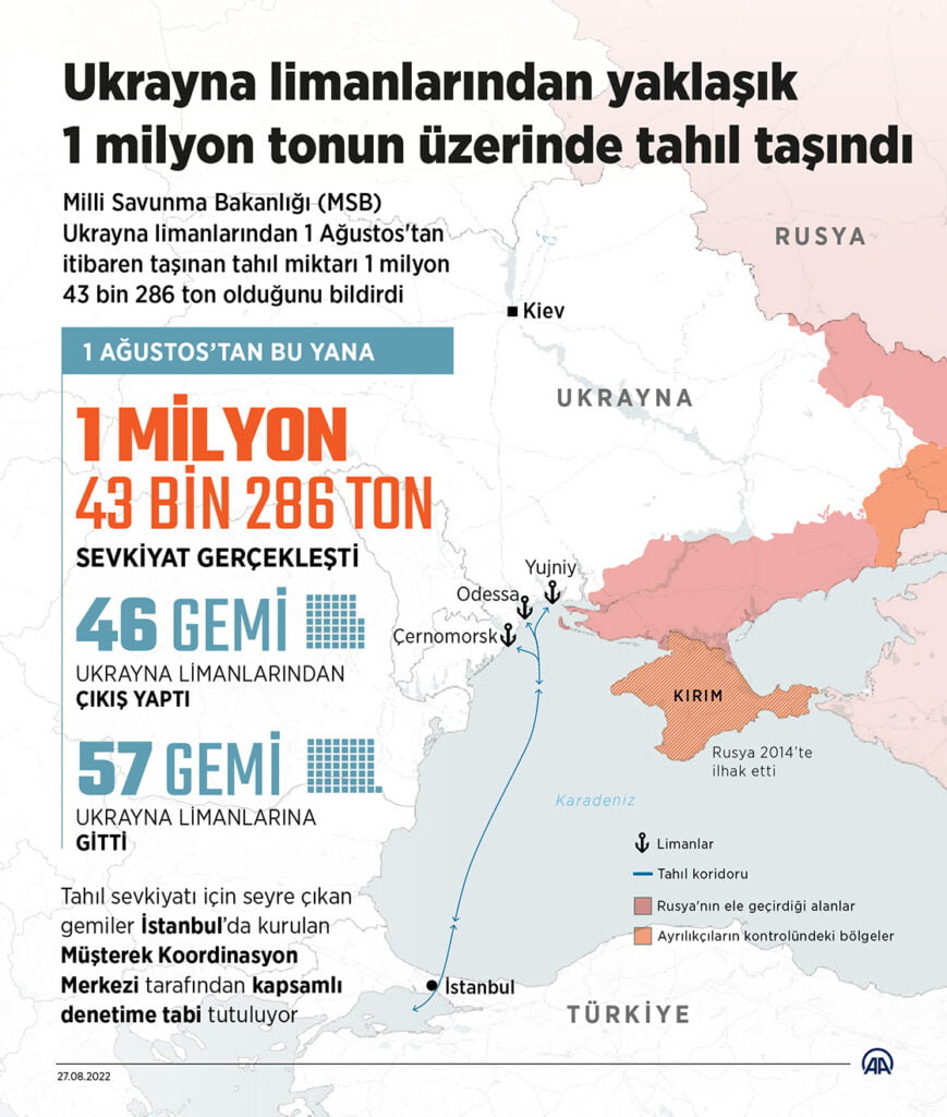 Bakanlıktan yapılan açıklamada, Cumhurbaşkanı Recep Tayyip Erdoğan ile Birleşmiş Milletler (BM) Genel Sekreteri Antonio Guterres'in riyasetinde 22 Temmuz'da imzalanan "Tahıl ve Yiyecek Maddelerinin Ukrayna Limanlarından Emniyetli Sevki Girişimi Belgesi" ile Ukrayna limanlarındaki tahıl sevkiyatının planlandığı gibi devam ettiği belirtildi.