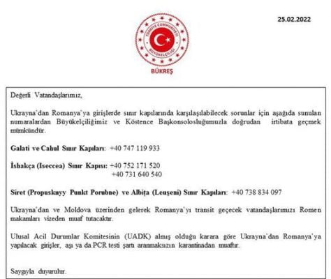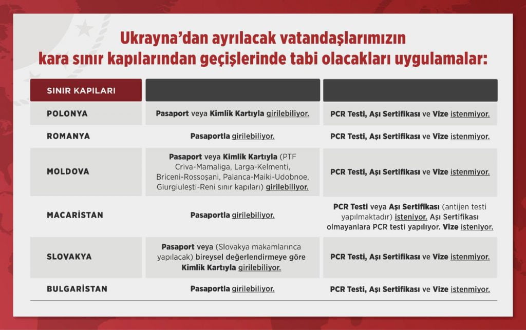 Türk vatandaşlarını taşıyan otobüsler, sabah saatlerinde Romanya sınırında bulunan Orlivka bölgesine ulaştı. Ülkeyi terk etmek isteyenler Orlivka Sınır Kapısı'nda 20 kilometre uzunluğunda araç kuyruğu oluşturdu. Türk vatandaşları, yaklaşık 6 saattir kuyrukta beklediklerini söyledi.