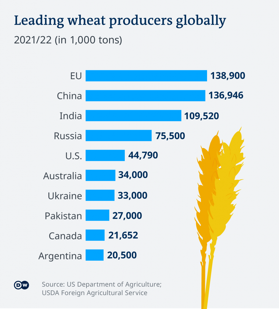 Almanya Federal Ekonomik İşler ve İhracat Kontrol Ofisi'ne göre, Ukrayna'nın buğday üretimi dünya pazarının %11,5'ini oluştururken, Rusya'nın payı ise %16,8. Mısır söz konusu olduğunda, Ukrayna dünya ihracat pazarının %17'sini karşılamaktadır.