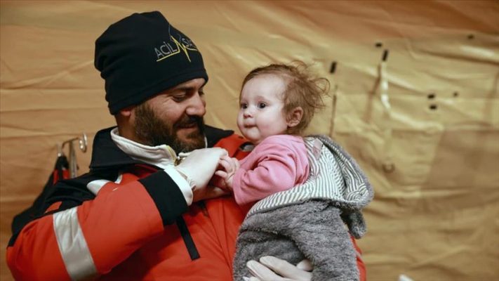 Bir Kızılhaç gönüllüsünün yardımına koştuğu anne ve bebek, acil olarak Sağlık Bakanlığı Ulusal Medikal Kurtarma (UMKE) ekiplerinin bulunduğu sahra hastanesine getirildi.