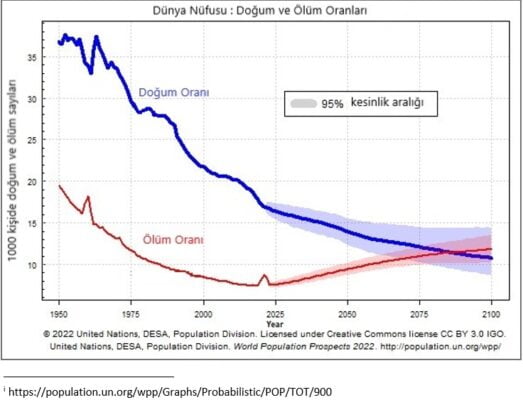 Şekil 3’de tüm dünyadaki doğum ve ölüm oranlarının gelişimini görebiliyoruz. Grafikte doğum ve ölümler nüfusun 1.000 kişisi başına oran olarak verilmiş. Bu grafikten anladığımız doğum oranlarında hızlı bir azalma söz konusu ve bu azalma 1960’lardan bu yana sürmekte. Sebeplerini incelemeye bir kenara koyarsak bu azalmanın elimizdeki incelemeye göre 2100 yıllarında da devam etmesi bekleniyor. Şekil 3’de yine aynı şekilde 1950’den bu yana tüm dünyadaki ölüm oranlarını da görüyoruz. Mavi renkli eğriyle verilmiş olan ölüm oranlarında 2025’e kadar sürecek bir düşüş görünüyor. 2025’ten sonra, özellikle İkinci Dünya Savaşı sonrasındaki nüfus patlamasında doğanların doğal hayat beklentisi sonuna yaklaşmasıyla, ölüm oranlarında artan nüfusa rağmen bir yükselme bekleniyor. 2075 civarında doğum oranlarının ölüm oranlarının altına inmesiyle toplam nüfusta beklenen sabitlenme gerçekleşecek gibi gözüküyor.
