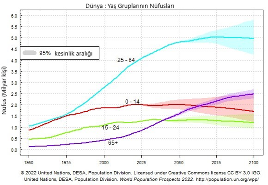 Şekil 2’de bu artan nüfusun yaş aralıklarına dağılımını görüyoruz. İşin sadece artan nüfusu beslemek için gerekli besin kaynaklarını bulmak ve barınma sorunlarını gidermek olmadığını bu grafikten anlayacağız. Şekil 2’de 25-64 yaş aralığındaki çalışan ve üretken nüfusun dünya nüfusunun toplamı içinde yaklaşık % 50’sini yani yarısını oluşturacağını görebiliyoruz. 0-14 ve 15-24 yaş grubundaki çocuk ve genç sayısının bugün olduğu seviyelerde kalacağını veya biraz gerileyeceğini yine tespit edebiliyoruz. Grafikte çalışan nüfusu etkileyecek diğer önemli veri 65 yaş üstü nüfusun ulaştığı nokta olacak. 2020’lerden sonra hızlı biçimde artan 65 yaş üstü nüfusun toplam içindeki payının 2050’ler sonrasında 2 buçuk milyara yani %25 ulaşmasını bekliyoruz. Bu durum 65 yaş üstü nüfusun doğası gereği toplum hayatının birçok alanında yansımalar yaratacaktır. İkinci elimizde tutmamız gereken konu bu olacak. 1950’ye baktığımızda yine çalışan nüfusun yani üreten nüfusun toplumun yarısına eşit olduğunu görüyoruz ancak çalışmayan nüfustaki dağılım daha farklı. o dönemde çalışmayan nüfusun içinde çocuk ve genç oranı çok daha ağırlıklı. 65 yaş üstü nüfus 2065’ten sonra çalışmayan nüfus içinde en ağırlıklı kesimi oluşturacak. - OLGU : 5 milyarlık çalışan nüfusa karşılık 5 milyar çalışmayan ve geçinmek için desteğe ihtiyacı olacak bir kitle olacak.