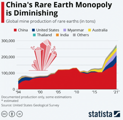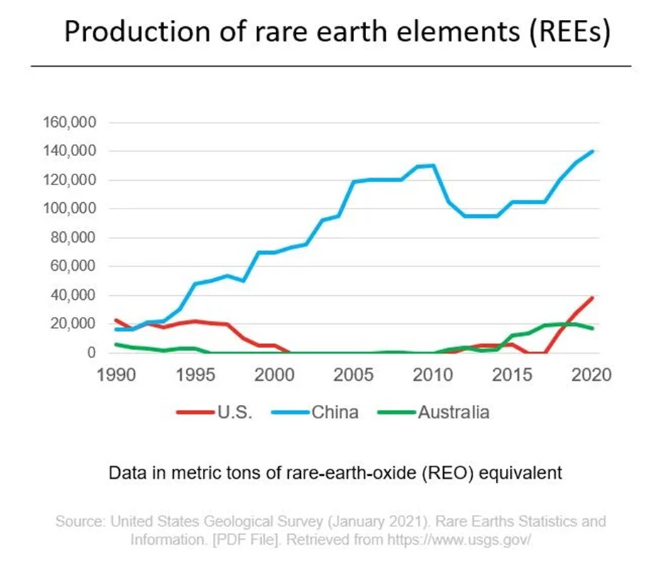 Nadir toprak elementleri yıllık üretim gelişimi : Endüstrinin çoğu, daha düşük maliyetler nedeniyle son yirmi yılda Çin'e taşınmıştır. Çin 1990'larda dünya fiyatlarının altına düşünce dünyadaki madenler kapatıldı. Bugün gereken, karlı şekilde çıkarmak