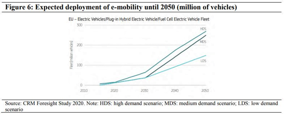 Bu durumda bir de talebe göz atalım. Şekil 5’te yer alan grafik tüm dünyada otomobil parkında beklenen elektrikli otomobil parkının 2050 itibarıyla 300 milyonun üzerinde olacağını bildiriyor. Bu tabii 2020 yılında yapılan bir öngörü çalışması. Bugün itibarıyla Avrupa Topluluğundaki ağırlıklı ülkelerin 2030’da sadece elektrikli araçların satışına izin vermeyi planladığını biliyoruz. Bunun neticesinde otomotiv sektörü çok hızlı biçimde kabuk değiştiriyor ve bu değişim aslında tahmin edilenden veya kamuoyunun algıladığında çok daha süratle gerçekleşiyor. Daha önceki yazılarda bu etkiyi görmüştük. Elektrikli araç talebindeki artışın madenlerin tüketimine etkisini de Şekil 6’da görebiliyoruz.