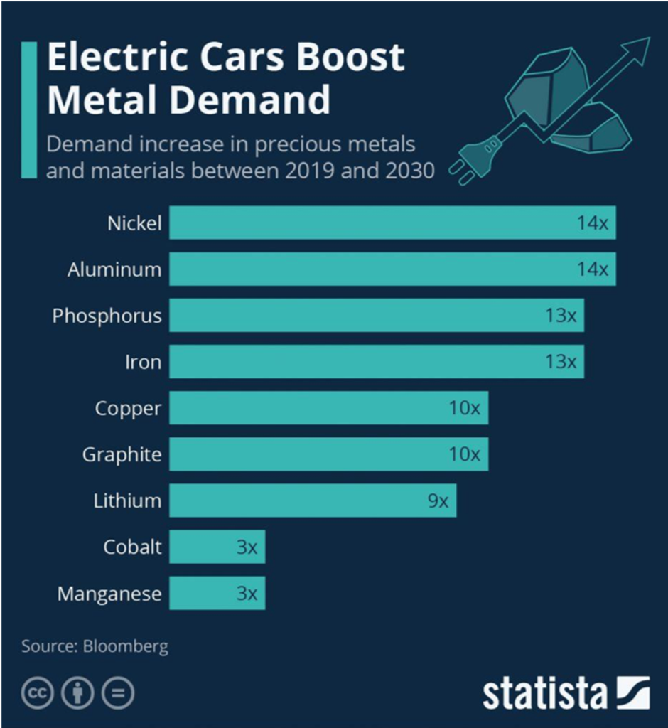 Otomobillerin elektriğe dönmesiyle birlikte kullanılan metallerin miktarında beklenen artış seviyesi. Örnek : Alüminyum miktarı araç başına 14 kat artacaktır.