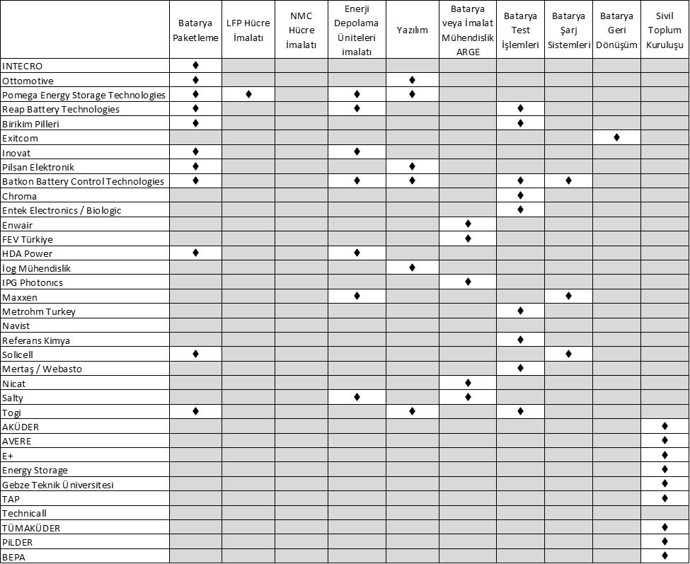 - Türkiye'nin hücre üretimi ve hammaddede pazar derinliği yaratamadığı görülmektedir. Bunun yanı sıra ESS veya elektrikli araç bataryalarının tescili için yetkili ve donanımlı, uluslararası yeterliliğe sahip ve tanınmış test laboratuvarlarına ihtiyaç olduğu belirtilmektedir.