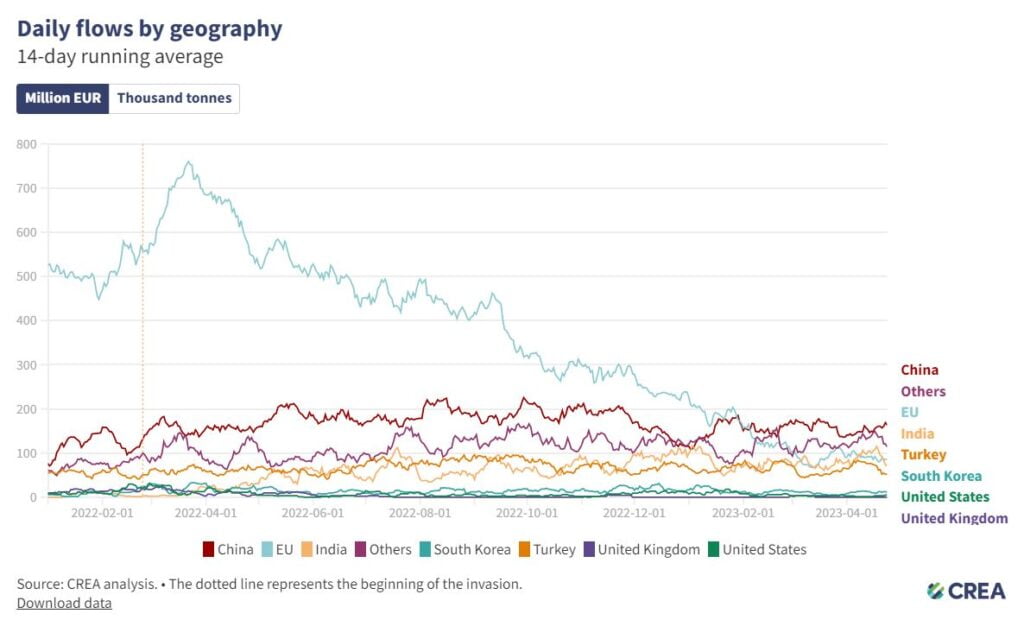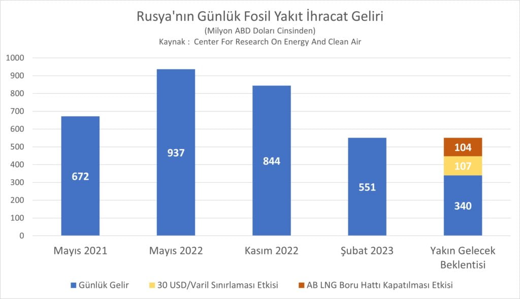 Savaşın önemi boyutlarından bir tanesi Rusya'ya karşı uygulanan yaptırımlar ve bu yatırımların neticeleri olarak öne çıkıyor. Amerika Birleşik Devletleri'nin öncülüğünde ve Avrupa Birliği'nin kuvvetli desteğiyle devreye alınan bu yaptırımlar Rusya ekonomisinin savaşı destekleme gücünü kırmayı hedefliyor. Rus ekonomisinin en büyük girdi kaynağının fosil yakıtların ihracatı olduğunu uzun yıllardır biliyoruz. Avrupa Birliği üyeleri en başta Almanya olmak üzere karşılıklı bağımlılık ilkesi üzerinden fosil yakıt ithalatına Rusya'ya endeksleyerek Rusya'nın demokratik uluslararası topluluğa entegrasyonunu başarabileceklerini düşünmüşlerdi. Ancak bu karşılıklı bağımlılık Rusya tarafından zafiyet olarak değerlendirildi ve savaş sırasında veya en azından savaşın başında bir silah olarak kullanılmak istendi. Buna karşılık Avrupa topluluğu hızlı biçimde kaynak çeşitliliğine ve tabii enerji politikasında temel bir değişikliğe giderek karşılık verdi. CREA[1] tarafından derlenen bilgiye göre savaşın başladığı 2022 yılı Şubat ayından bu yana Avrupa Birliğinin Rusya'dan fosil yakıt ithalatı günlük 600.000.000 €'dan 150.000.000 € seviyelerine inmiş durumda. Yaptırımlara katılmayan veya sınırlı şekilde katılan ülkelerde bu anlamda büyük bir değişiklik görülmese de, Rusya'nın günlük ihracat gelirinin 550 milyon € seviyesinin altına indiğini, önümüzdeki dönemde Avrupa birliğinin yeni yaptırımlarıyla (LNG boru hattının kapanması ve azami 30€/varil fiyat sınırlamasına geçilmesi) günlük gelirinin 350 milyon €'nun altına düşmesi bekleniyor.