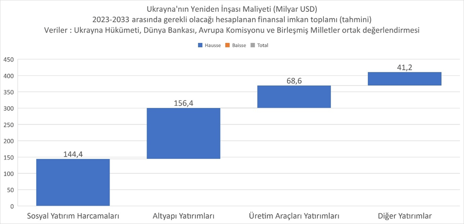 Bunun alt harcama kalemlerine baktığımız tabloda inşaat kalemlerinin önemli bir miktar tuttuğu gözükse de, en az onlar kadar önemli miktarda imalat ve ticaret yatırımlarının söz konusu olduğunu görüyoruz. bu vesileyle ve geleceğe hazırlanmak adına Türk ve Romen ekonomi aktörlerinin inşaatın yanı sıra imalat ve ticaret ürünlerine de hazırlanmaları faydalı olacaktır. Bu büyüklükte bir pazar örneğin Türk makine imalatçılarının önünü açabilecektir. Türkiye veya Romanya'da yapılabilecek bir imalat faaliyetiyle Ukrayna pazarının derinliğinden faydalanarak Avrupa pazarına kapı açmak söz konusu olabilecektir. Aynı zamanda savunma sanayinin de savaş sonrasındaki yeniden yapılanmada yer alması söz konusudur. Buradaki faaliyet bir yandan Ukrayna ordusunun yenilenmesi diğer yandan da savaş artığı malzemenin bertaraf edilmesi şeklinde olacaktır. Toplamda 400 milyar dolar olarak hesaplanan bu maliyet tabii ki kısa dönemli bir maliyet olmayacak ancak Ukrayna'nın yeniden yapılanma sürecinin ne kadar önemli bir pazar büyüklüğü yaratacağının da fikrini verecektir.