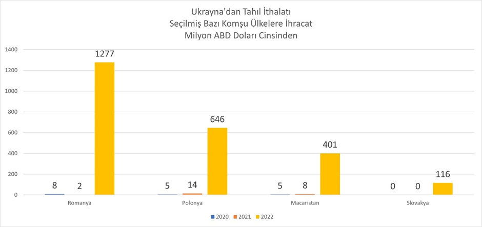 Rusya'nın yanı sıra Ukrayna ekonomisi de çatışmalardan şiddetli biçimde etkileniyor. Ülkenin karşılaştığı yıkım ile bir sonraki paragrafta yüzleşeceğiz. Ancak ondan önce savaşın Ukrayna'nın ihracat desenini nasıl etkilediğini ele almak gerekiyor. Bu aşamada Ukrayna'nın konuşuyor ülkelere yaptığı tahıl ihracatı ilginç bir veri olacaktır. grafikte görüldüğü gibi Romanya Polonya Macaristan ve Slovakya üzerinden Ukrayna'nın 2020 yılındaki tahıl ihracatı toplamda 18 milyon ABD doları civarında görülüyor. 2022 yıl sonundaki verilere baktığımızda ise bu 4 ülkeye tahıl ihracatının 2 milyar 200 milyon dolar seviyesinin üstüne çıktığını görüyoruz. Yani savaşın başlamasından sonra Ukrayna ihracat kanallarını değiştirmiş ve ürettiği tahılın önemli bir kısmını komşu ülkeler üzerinden satmaya başlamış. Bunu sadece geçici bir durum olarak görmemek yerinde olur çünkü bir kere ihracat kanallarını açtıktan sonra bu yollardan ilerlemenin verimli olacağını bir daha kolay olacağını mutlaka ihracatçı ülke değerlendirecektir. Romanya bu anlamda büyük bir avantaj kazanmış görünüyor.