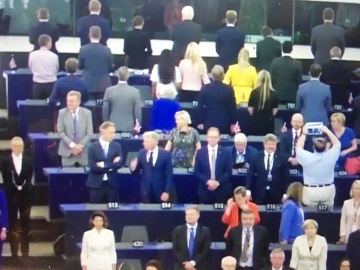 Yeni kurulmasına rağmen Avrupa Parlamentosu'nda 29 sandalye elde eden Brexit Partisi parlamenterleri Strasbourg'da düzenlenen açılış oturumunda Avrupa Birliği Milli Marşı'nı sırtını dönerek protesto etti.