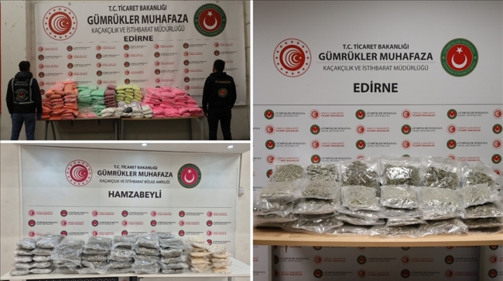 "Edirne, Hamzabeyli ve Sabiha Gökçen Gümrük Muhafaza Kaçakçılık ve İstihbarat birimlerimizce yürütülen operasyonlar neticesinde, 2 milyon 500 bin ecstasy, 170 bin 500 captagon, 74 kilogram esrar, 26 kilogram sentetik uyuşturucu madde ele geçirildi, yakalanan uyuşturucu maddeler imha edildi."