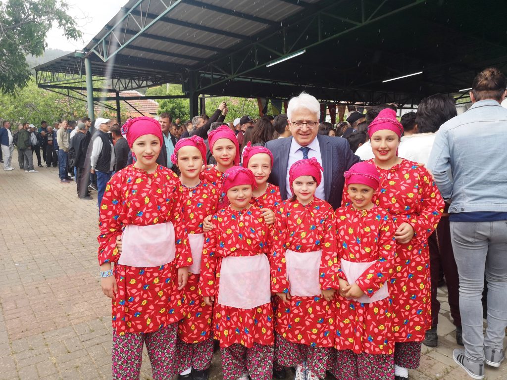 28. Hıdırellez Bahar Şenliklerine katılmak için Valandova’ya gelen CEVİZ Hayvancılık ve Tarımcılık Derneği üye çiftçileri, projenin uygulandığı yıllarda TİKA proje uzmanı olarak Yörük Türkleri ile birlikte Doğu Makedonya’da projelerde sahada çalışarak onlara yıllarca destek olan, ancak bugün TİKA Balkanlar ve Doğu Avrupa Dairesi Başkanı olarak Rumeli’ye hizmet eden Dr. Mahmut Çevik’i ürettikleri ballar ile karşılayarak TİKA’ya teşekkürlerini ilettiler.