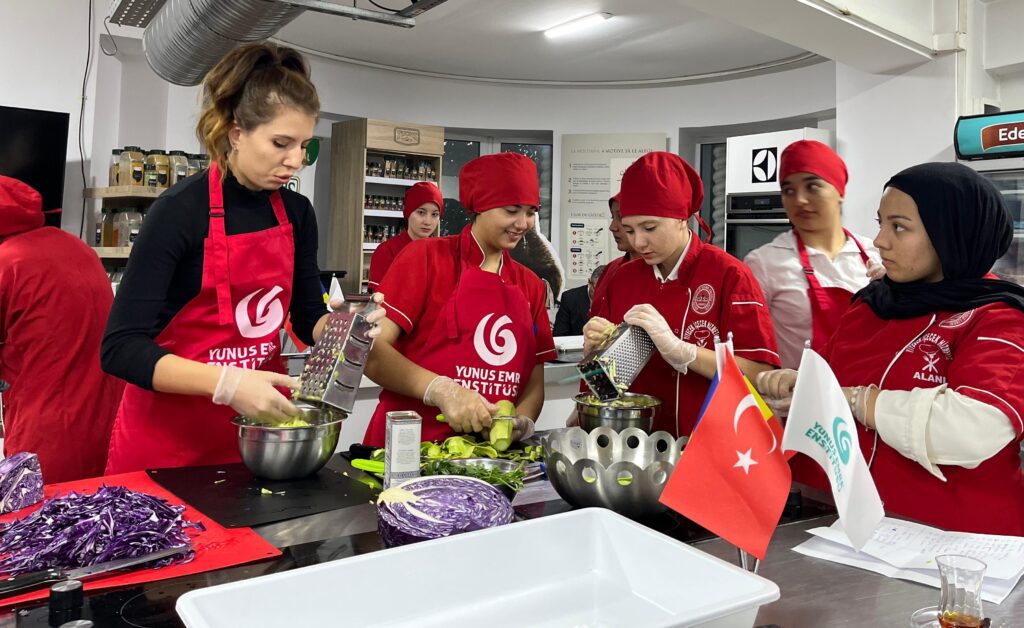 Erasmus Projesi ile Bükreş’te bulunan Osmaniye Düziçi Atatürk Mesleki Teknik ev Anadolu Lisesi Aşçılık Bölümü öğrencileri de yörelerine ait şakşuka, mücver, çiğköfte, sıkma ve salatayı hocalarının gözetiminde ve katkılarıyla yaptılar. Her bir öğrenci yaptığı işlemleri ayırtısına kadar Rumen dostlarımıza anlattı.